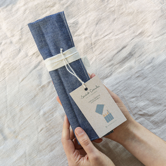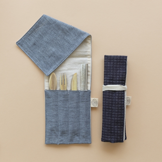 Portacubiertos realizados a partir de descartes de la industria textil generados durante la confección de indumentaria de denim. Los colores son todos tonos azules (como se ve en la imagen) y cada uno de ellos es de una partida de tela única.